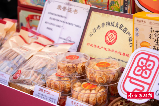此外,云浮各地的“宝藏”风味也在此集结:酸甜生津的新兴凉果黄皮蜜饯、酱香浓郁的罗定豆豉鸡配料、香气扑鼻的擂茶粥,以及承载着丰收寓意的非遗炒米饼,共同构成了一个让人流连忘返的味觉乐园。